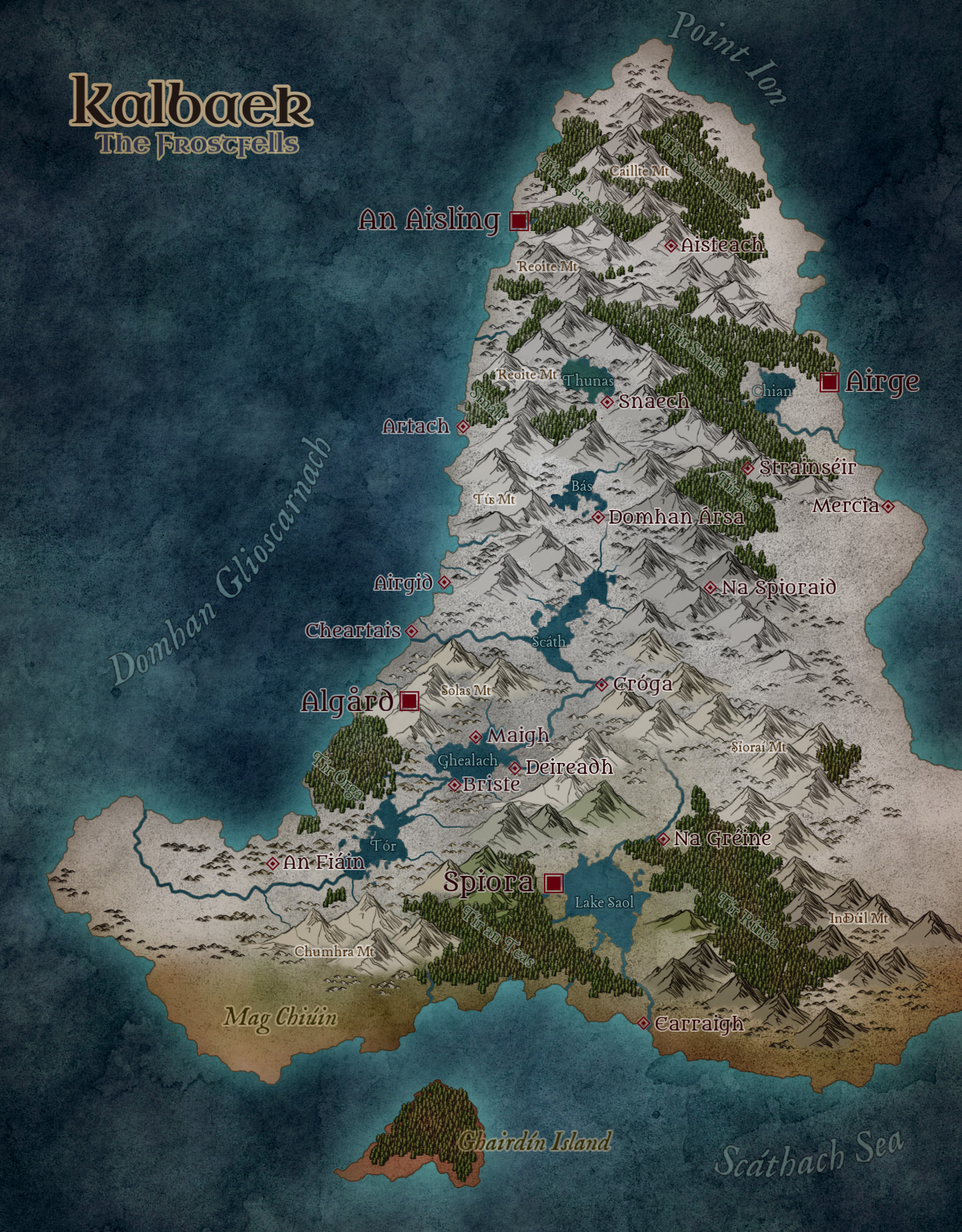 Airge | A scattered kingdom of clans gather here, from across the whole of the eastern coasts of Kalbaek. They are the only port that can trade with Kethraelm across the Sea of crystal rain and have the best ship builders in the realm. | Medium City | Luthren Fergus (Ingaz) |